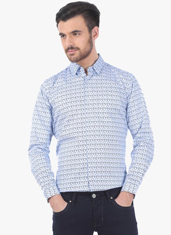Basics Blue Printed Slim Fit Casual Shirt