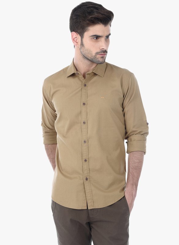 Basics Khaki Solid Slim Fit Casual Shirt
