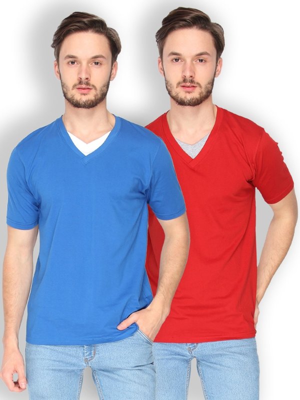 Campus Sutra Solid Men's V-neck Blue, Red T-Shirt(Pack of 2)