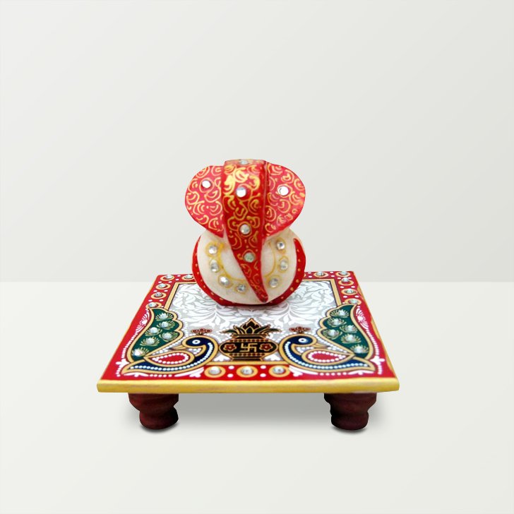 Chitra Handicraft Marble Chowki Ganesh With Peacock And Kalash Print