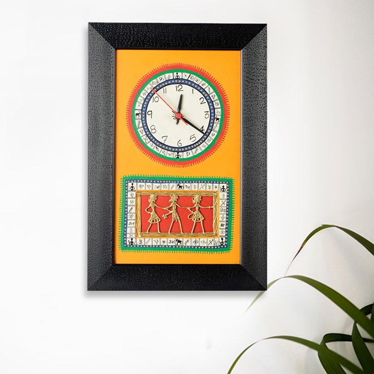 Exclusivelane Warli Handpainted Dhokra Work Clock Black And Yellow
