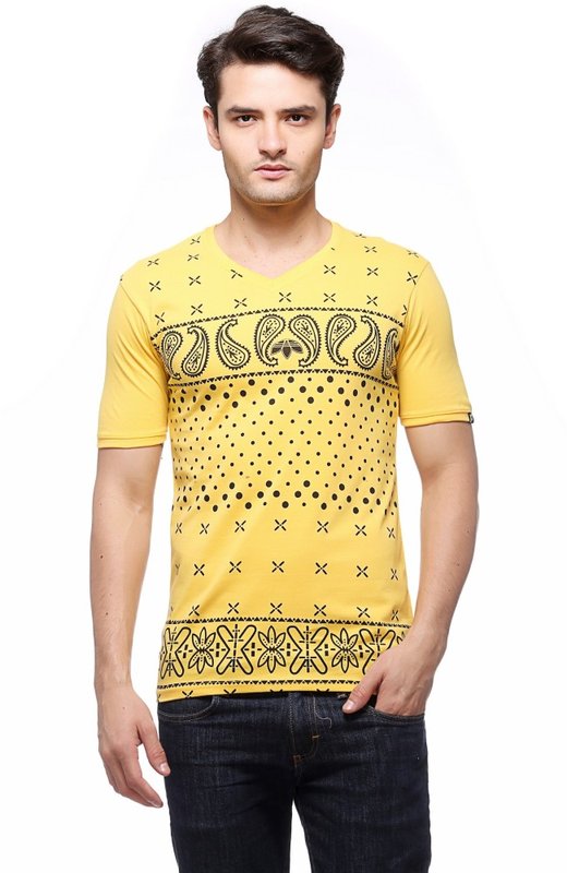 Flipkart has Fasnoya Printed Men's V-neck Yellow T-Shirt for Rs.899.00 - Rs.250.00 (Instant Discount) = Rs.649.00 with Free Shipping