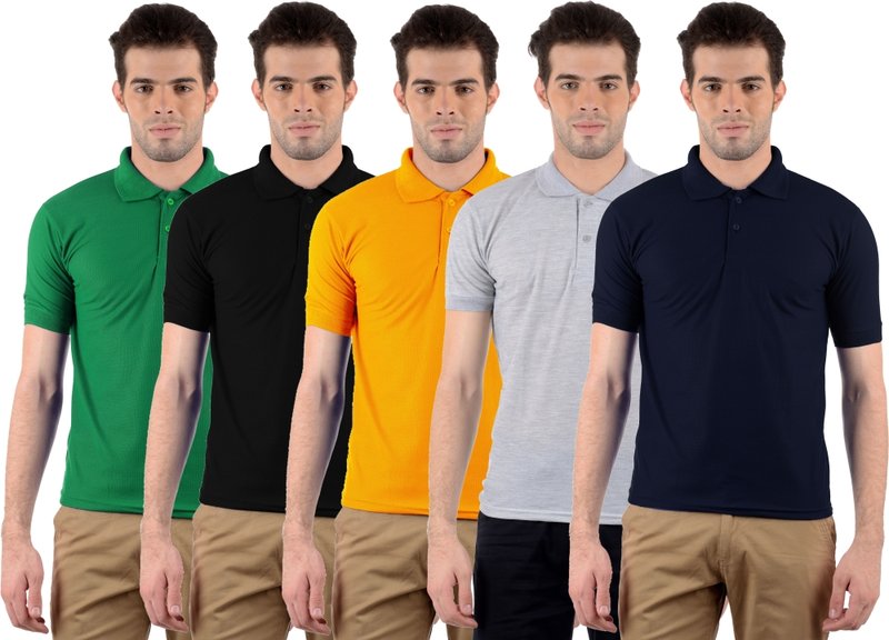 Gdivine Solid Men's Polo Neck Green, Black, Gold, Grey, Dark Blue T-Shirt(Pack of 5)