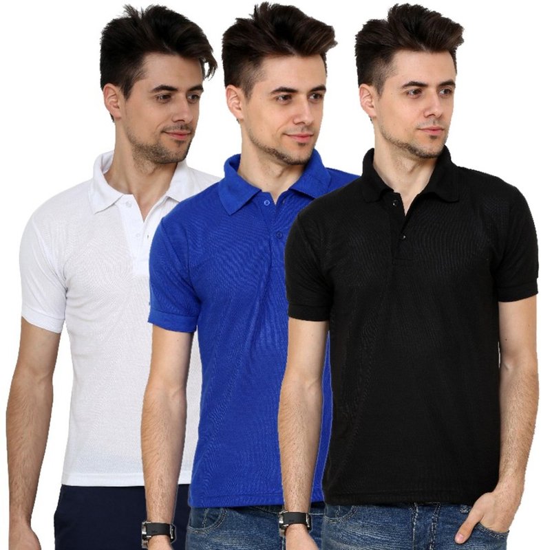 Grand Bear Solid Men's Polo Neck White, Black, Blue T-Shirt(Pack of 3)