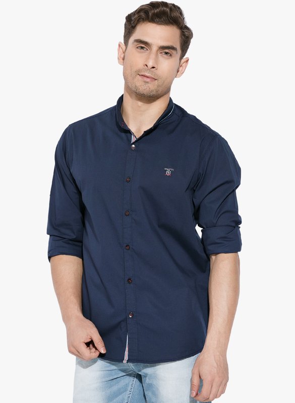 Mufti Navy Blue Solid Slim Fit Casual Shirt