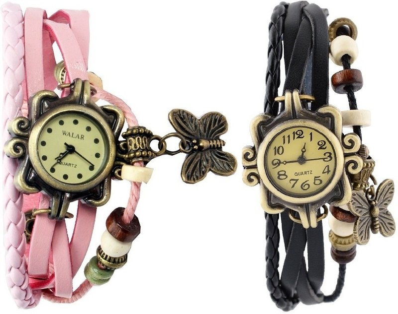 Pappi Boss Combo Offer Set of 2 Vintage Black & Light Pink Leather Bracelet Butterfly Analog Watch - For Girls, Women