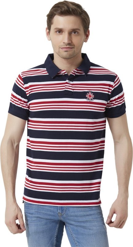 Peter England Striped Men's Polo Neck Blue T-Shirt