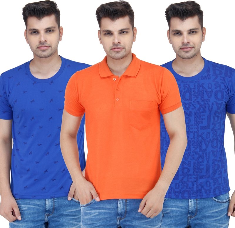 Stylogue Solid, Printed Men's Polo Neck, Round Neck Multicolor T-Shirt(Pack of 3)