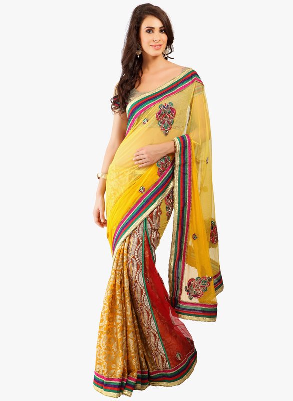 Jabong has Triveni Sarees Yellow Embroidered Wedding Wear Lehenga Saree for Rs.3,000.00 - Rs.700.00 (Instant Discount) = Rs.2,300.00 with Free Shipping